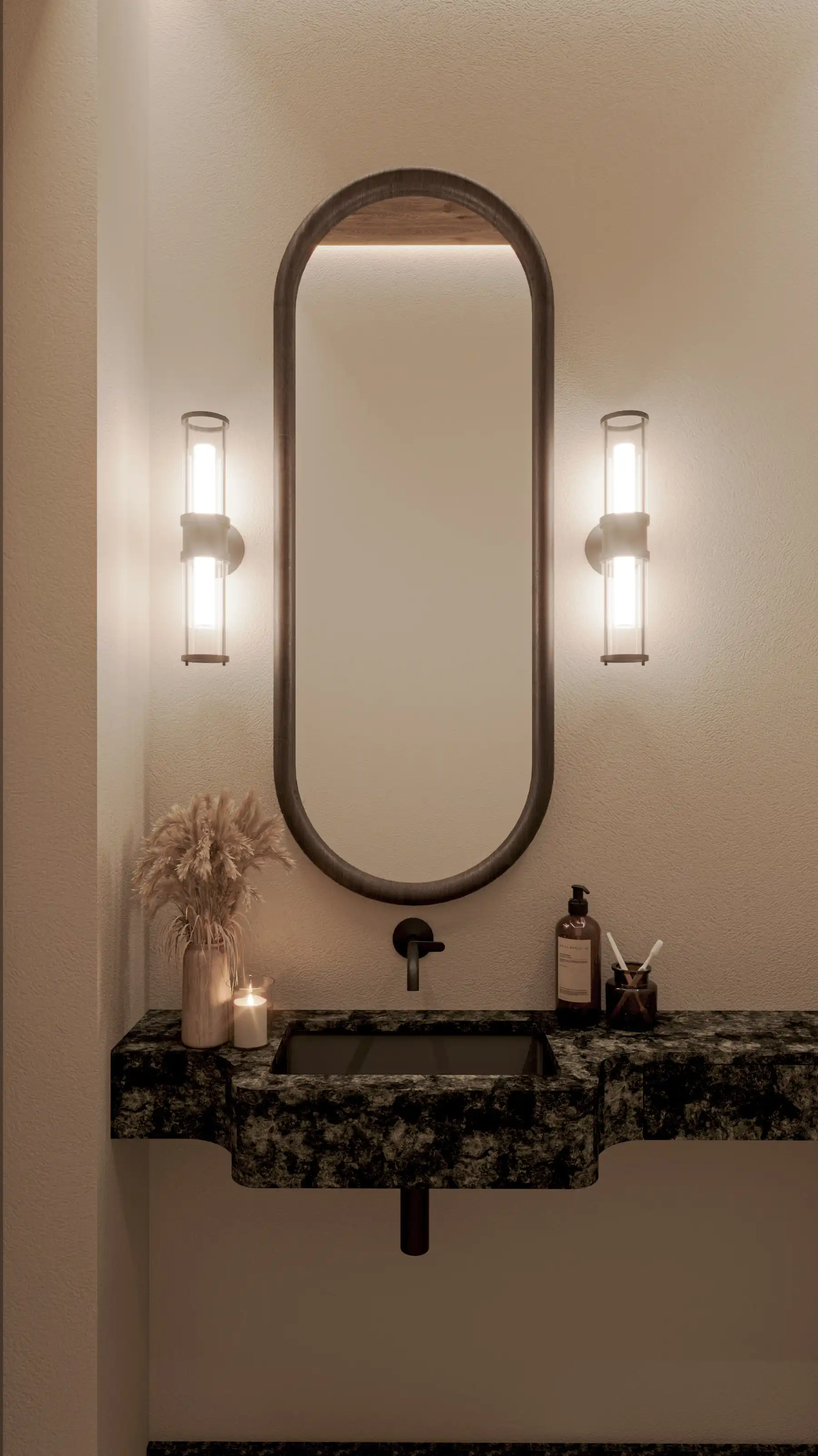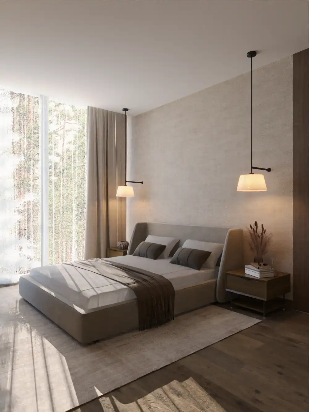 Kluczowym elementem definiującym charakter tej rezydencji są promienie słoneczne, które wchodzą w interakcję z wnętrzem w ciągu dnia, tworząc nieustannie zmieniający się nastrój. Ogromne przeszklenia salonu oraz sypialni nie tylko zapewniają obfitość naturalnego światła, ale także stanowią ramę dla widoku na otaczający las. Ten bezpośredni kontakt z naturą jest intencjonalnie włączony do projektu, sprawiając, że zieleń za oknem staje się integralną częścią dekoracji, zarówno w przestronnym salonie, jak i w prywatnych strefach. Po zmroku główne skrzypce przejmuje oświetlenie wewnętrzne, które akcentuje tekstury i detale, od drewna po kamień. Rozproszone światło dodaje lekkości wnętrzu i zachęca do odpoczynku.