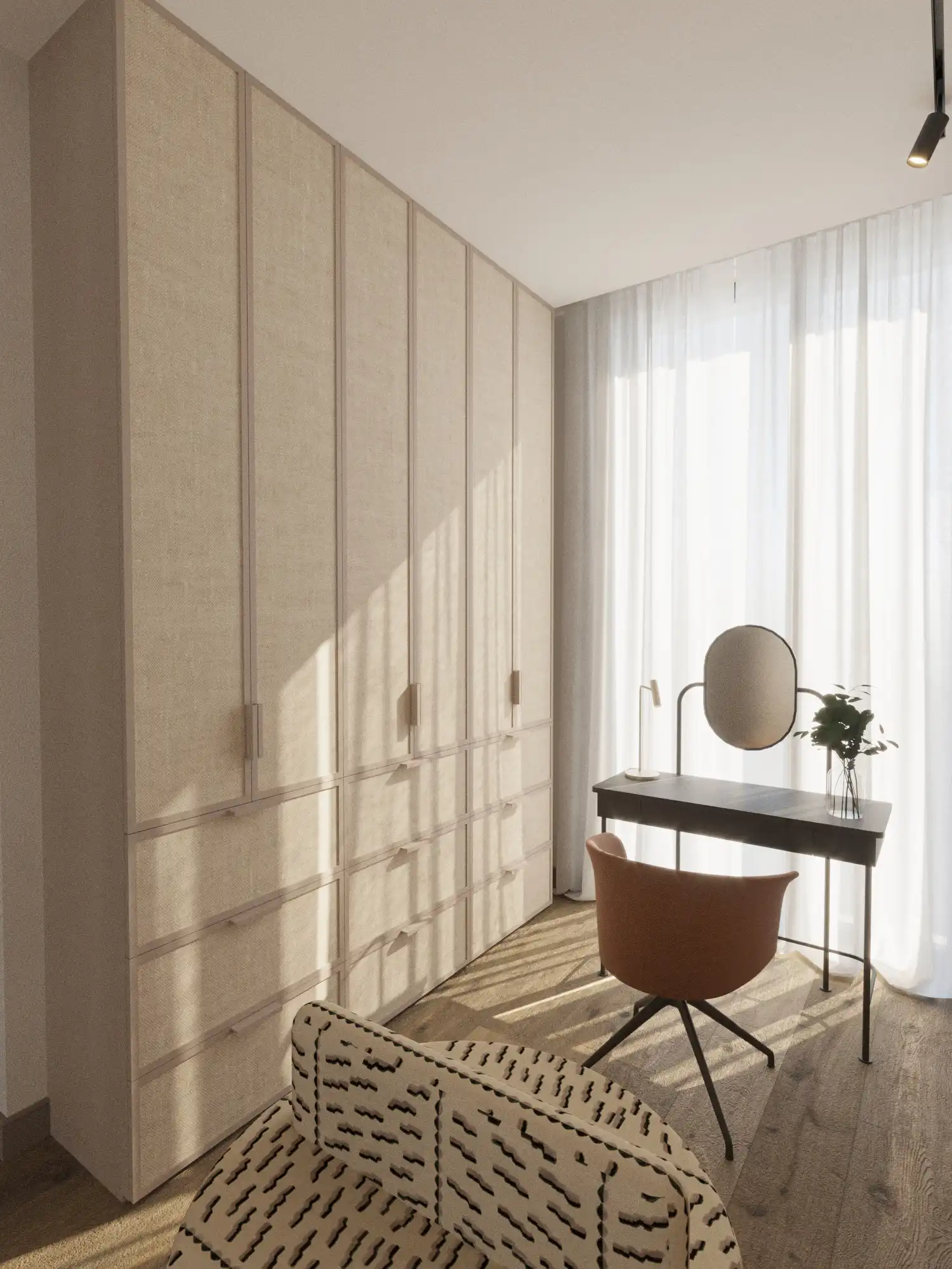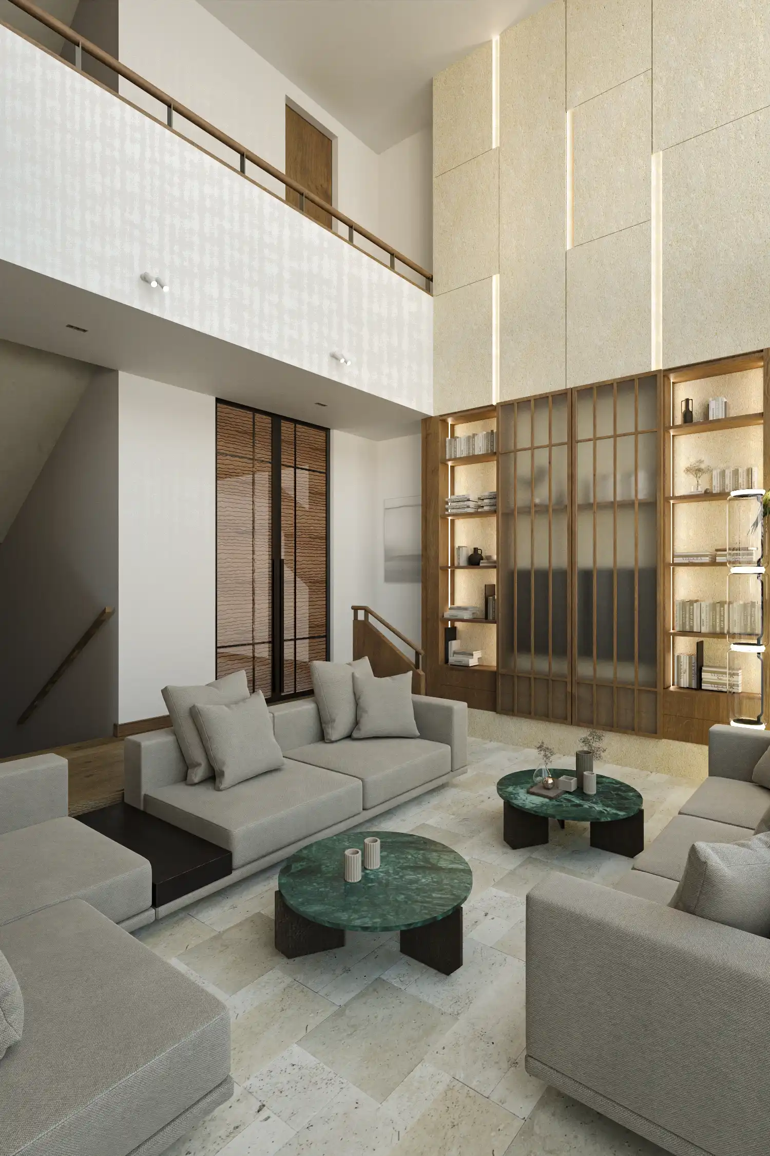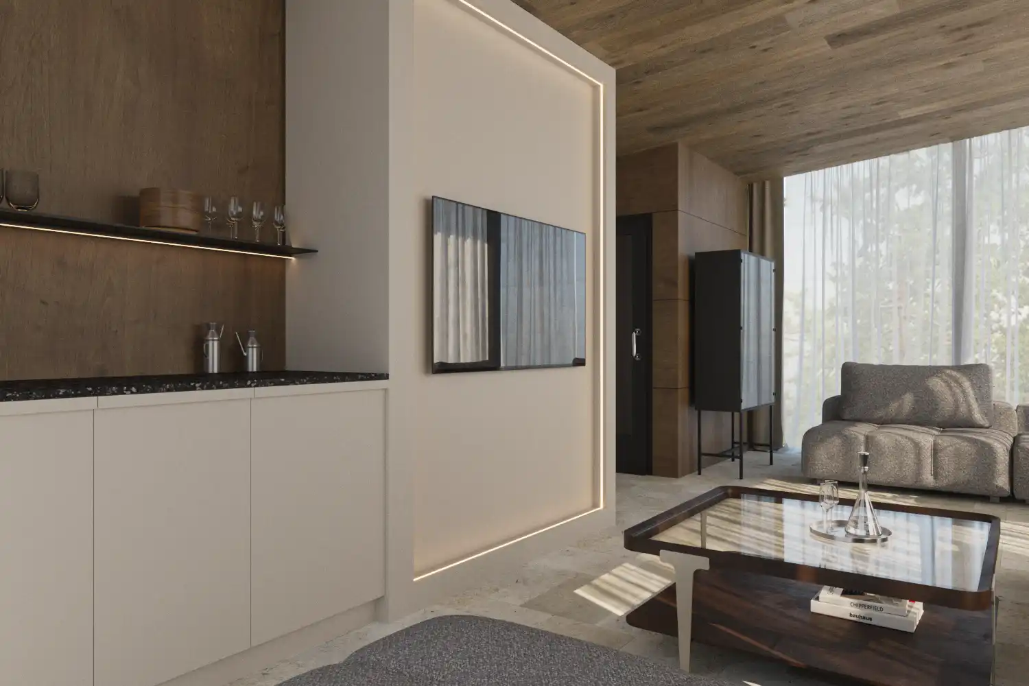 Wyjątkową podstawę dla tej symbiozy światła i natury stanowi posadzka w salonie, wykonana z jasnego trawertynu. Materiał ten, ceniony za swoją naturalną elegancję i ciepłą paletę barw, został ułożony w klasyczny, rzymski sposób. Ten układ, charakteryzujący się mieszanką prostokątnych płytek o różnych rozmiarach, dodaje przestrzeni wrażenia ponadczasowości, jednocześnie łagodząc nowoczesną formę wnętrza. Surowość i naturalność trawertynu doskonale współgra z drewnianymi panelami ściennymi i stonowaną kolorystyką tapicerowanych mebli w salonie. To wszystko podkreśla spójną wizję całego projektu, której korzenie leżą w ziemistych i organicznych teksturach.